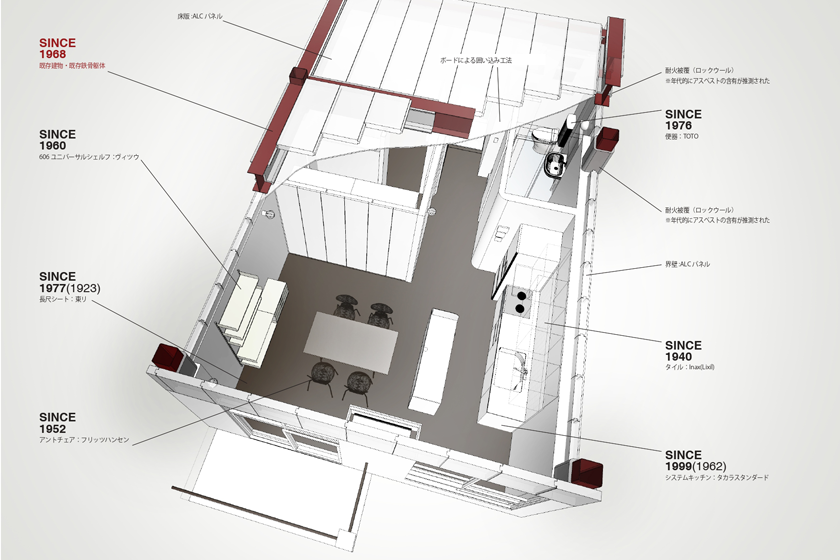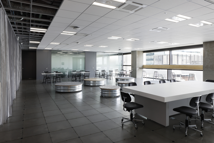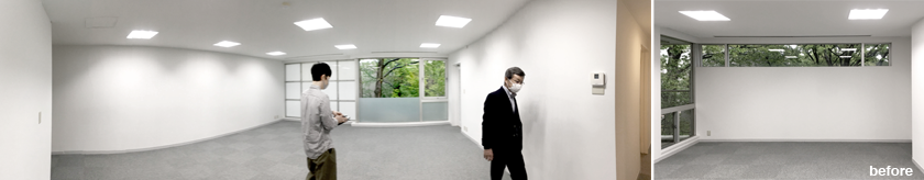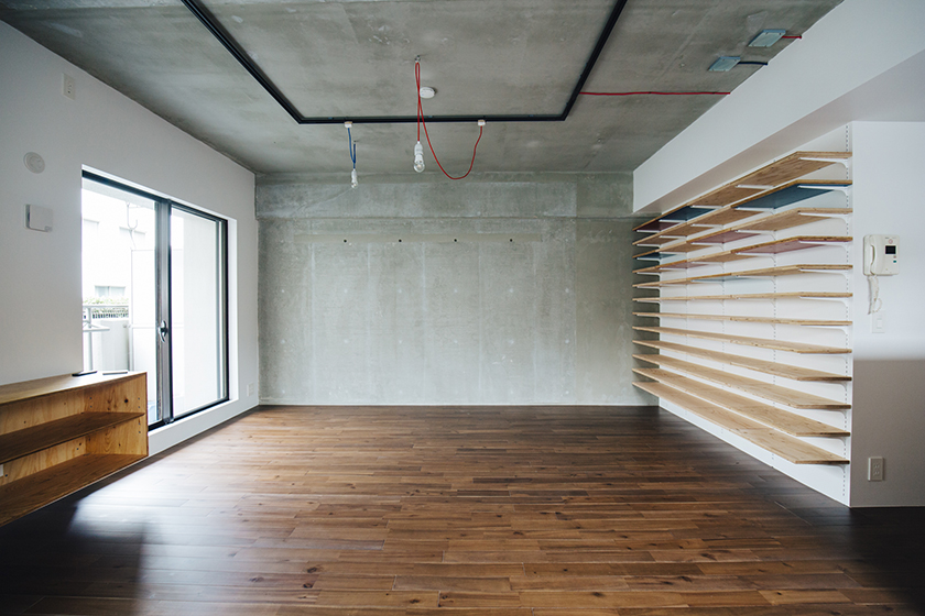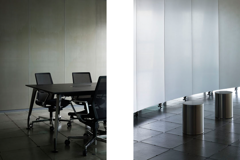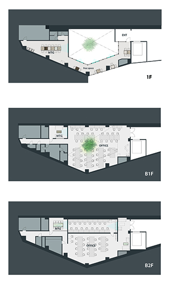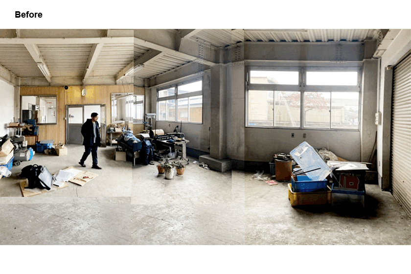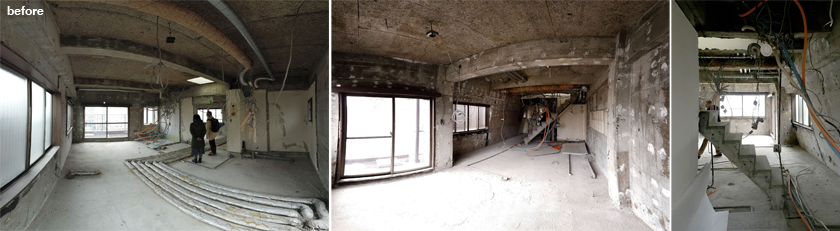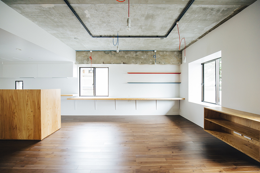 一方で、ビルの工事は既にスタートしていた。その為、建築工事の途中から施主サイドとしてプロジェクトに参画して工事サイドと協力する事で、A工事では下地の状態を引き渡しとし、C工事の仕上げ工事を即時にスタートできる様に仕様を調整。「倹約」の実践として仕上げを剥がした素地のマテリアルを多く採用する事で経年変化を許容して工期と工事費の大幅な圧縮を図った。結果としてC工事の内装施工費をFFE込みで30万円/坪を下回るパフォーマンスを実現した。