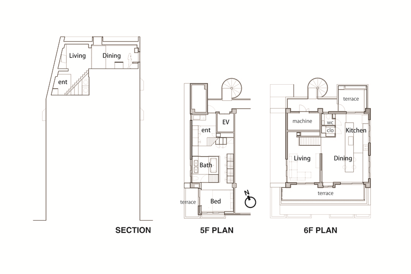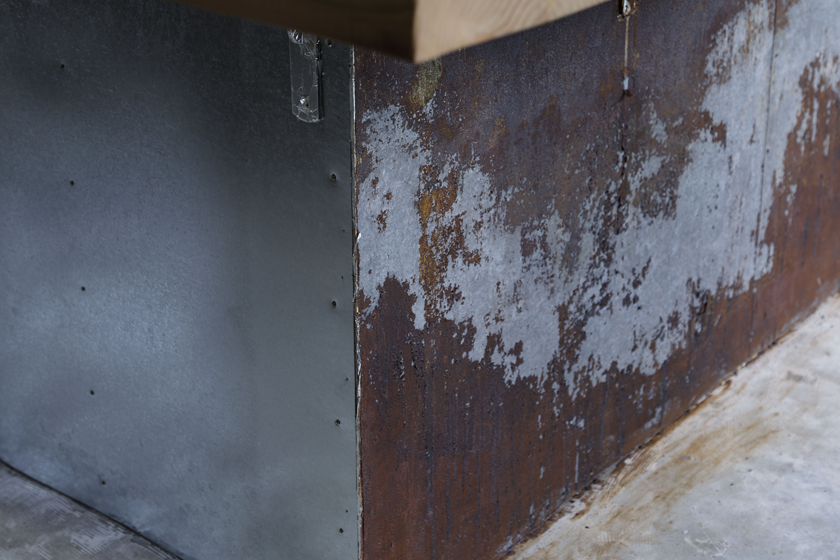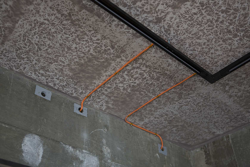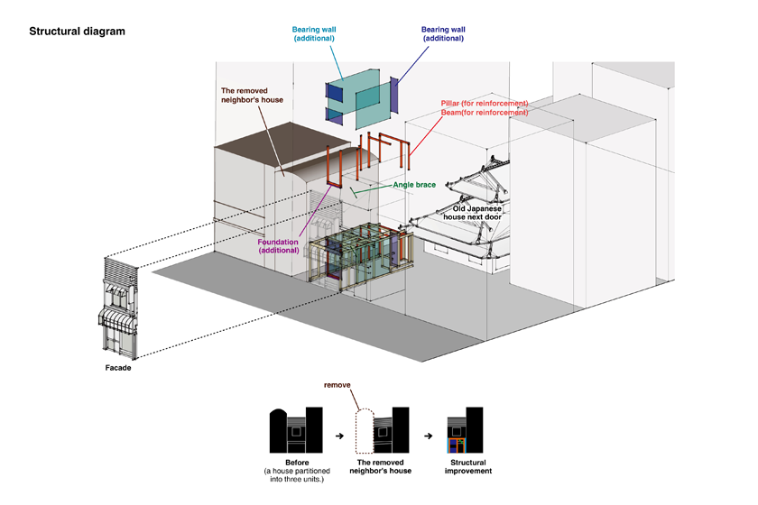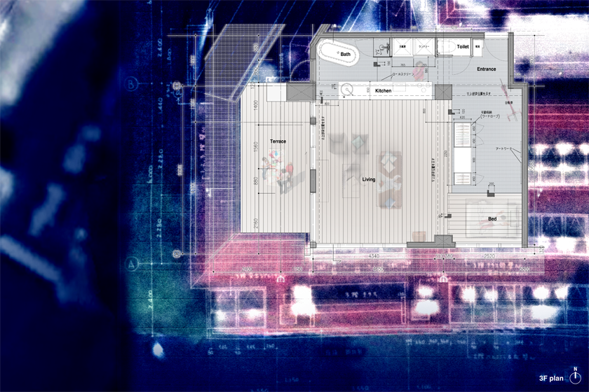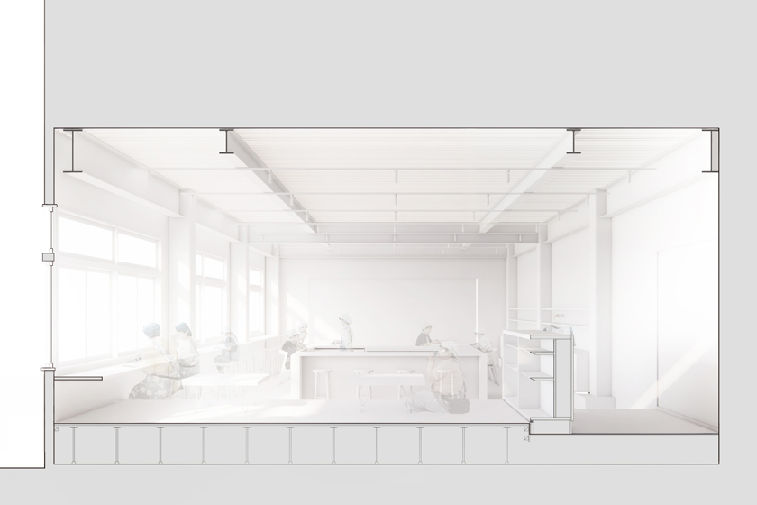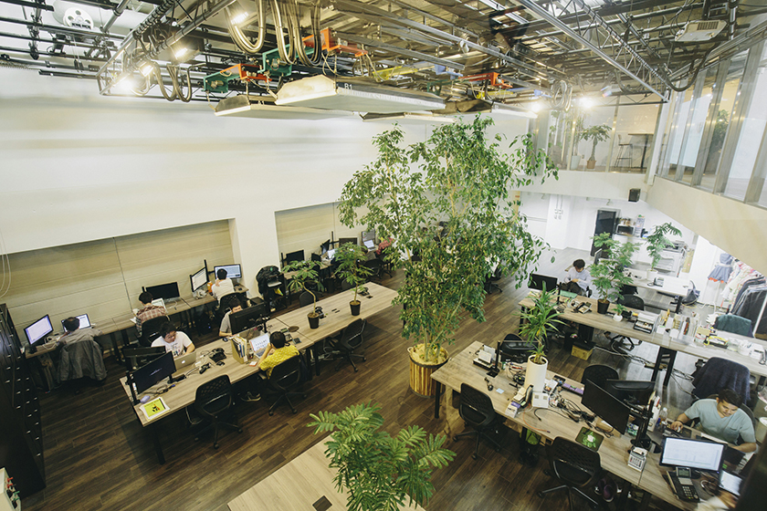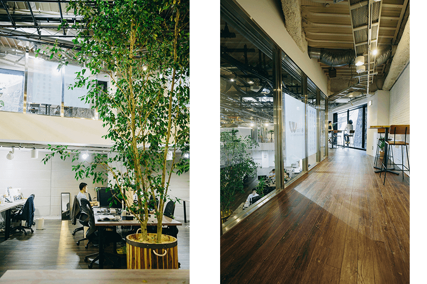 一方で、ビルの工事は既にスタートしていた。その為、建築工事の途中から施主サイドとしてプロジェクトに参画して工事サイドと協力する事で、A工事では下地の状態を引き渡しとし、C工事の仕上げ工事を即時にスタートできる様に仕様を調整。「倹約」の実践として仕上げを剥がした素地のマテリアルを多く採用する事で経年変化を許容して工期と工事費の大幅な圧縮を図った。結果としてC工事の内装施工費をFFE込みで30万円/坪を下回るパフォーマンスを実現した。