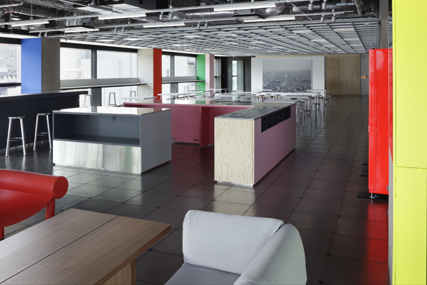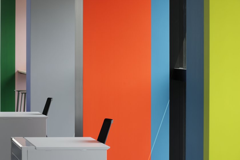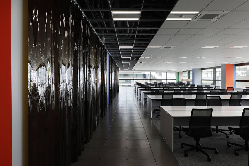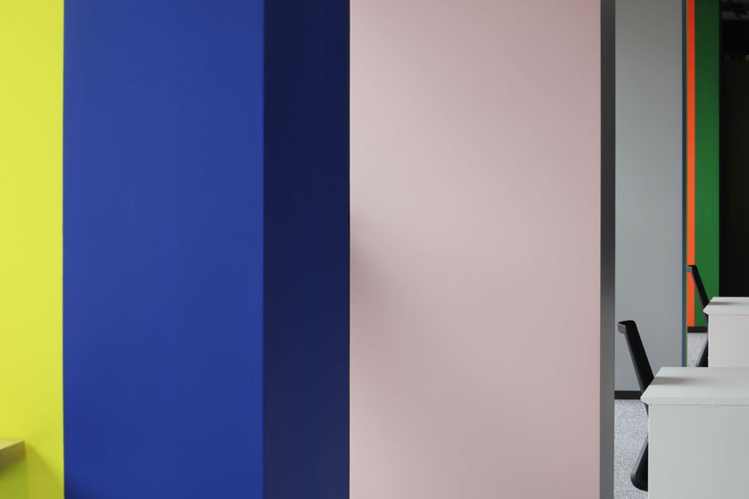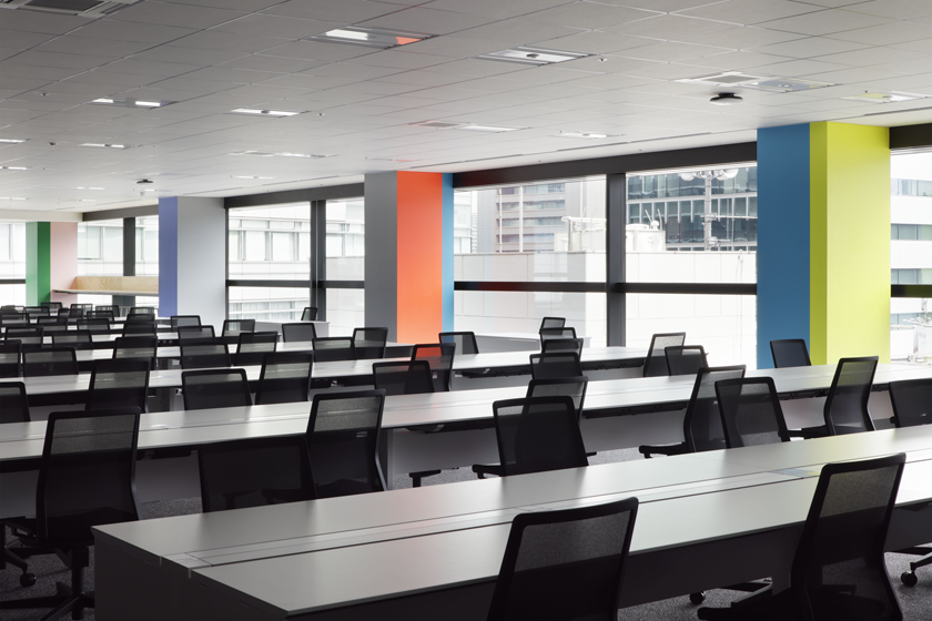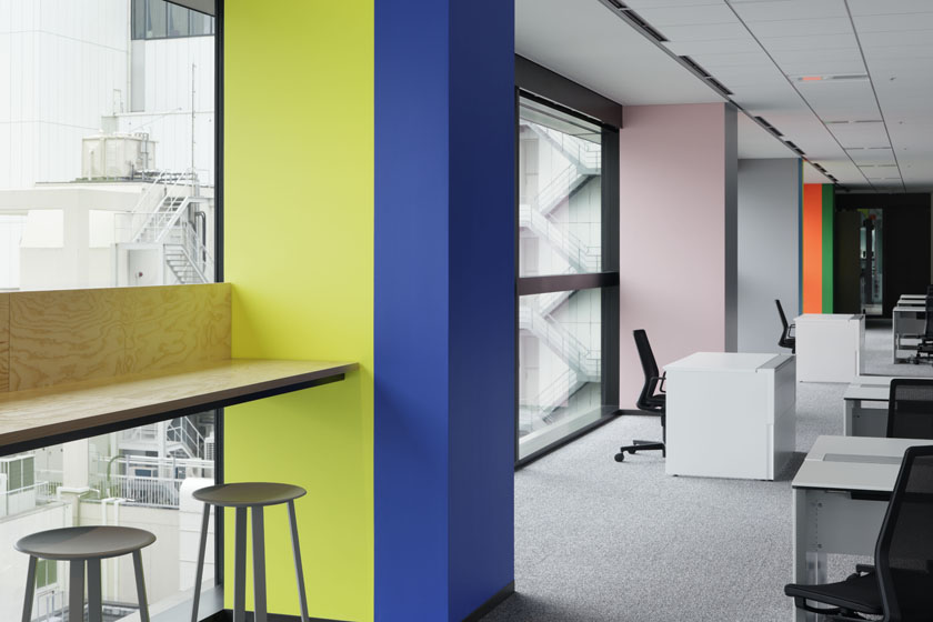 デザイン上重要なビビットなカラーは会社の新しいVIである白と黒のロゴマークをカラーバーの色彩に分解して施主の社是である「多様性」を表現したもの。我々はオフィスの柱や家具にビビットなカラーを散りばめてランダムに配置、視点を遠くまで運び実際の空間以上の拡がりを演出する事を意図してデザインした。