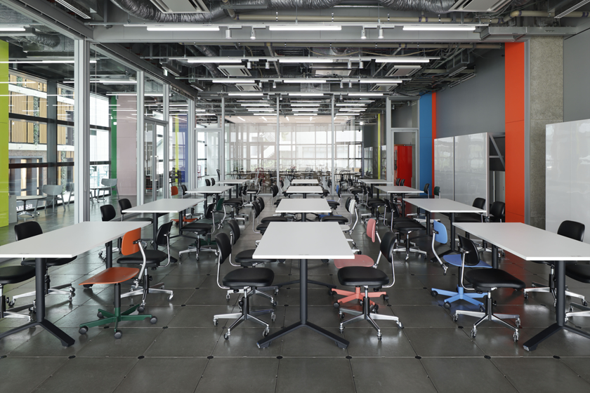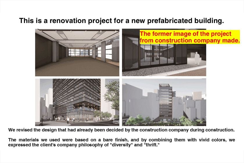 施主の要望は大きく二つ。一つ目の要望は「多様性」と「倹約」という社是の実践。二つ目の要望はリクルートに寄与する事。当時施主はドメスティックな金融業から東アジアを射程にしたIT金融業への変貌の最中で、採用(特にSE)に有利なデザイン性の高いオフィス空間を求めていた。